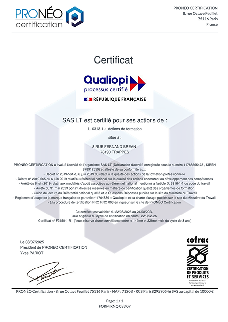L'organisme de formation LT est certifié QUALIOPI
